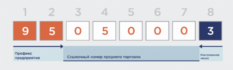 GS1 Prefiks – Milliy GS1 tashkilotiga berilgan unikal raqam (GS1 UZ). RF raqami - 46. Sotiladigan birlikka ishora qiladigan raqamni Uyushma a'zosidan olingan so'rovga muvofiq Milliy GS1 tashkiloti (GS1 RUS) beradi. Nazorat raqami shtrix kodlar raqami to'g'ri qo'yilganini tekshirish uchun xizmat qiladi. GTIN-8 raqami uchun EAN-8 belgilari qo'llanadi.